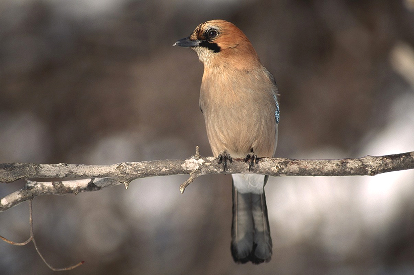 カケス類の代表種で、北海道にいるのはミヤマカケスという亜種。本州以南のカケスとは頭部などの色彩が明確に違います。