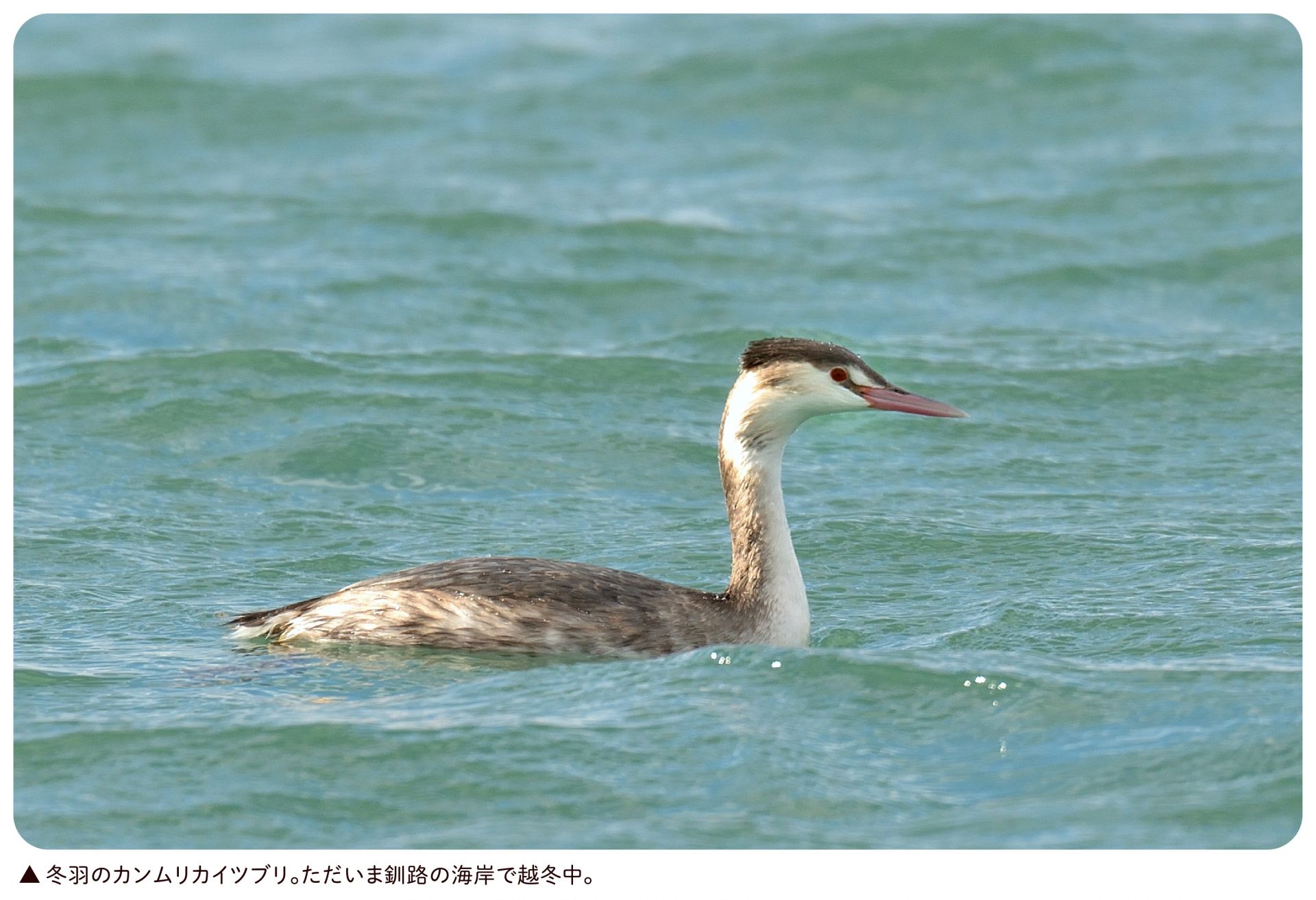 時代の変化を大きく感じることのひとつがカンムリカイツブリの生息状況である。あれほど貴重だったカンムリカイツブリは分布を広げ、さして珍しい鳥ではなくなっていたのだ。日本各地で越冬する姿が珍しくなくなり、繁殖地も激増した。北海道でも、道南では毎年繁殖するようになり、今では札幌近郊の沼でも繁殖することがある。さらに、越冬個体はどこででも見られる様相となって、例えば石狩川の河口や胆振・日高地方の漁港などにも時折姿を現してくれる。この20年ほどの間に減少した鳥も少なくない中、カンムリカイツブリは“勝ち組”に違いなかった。